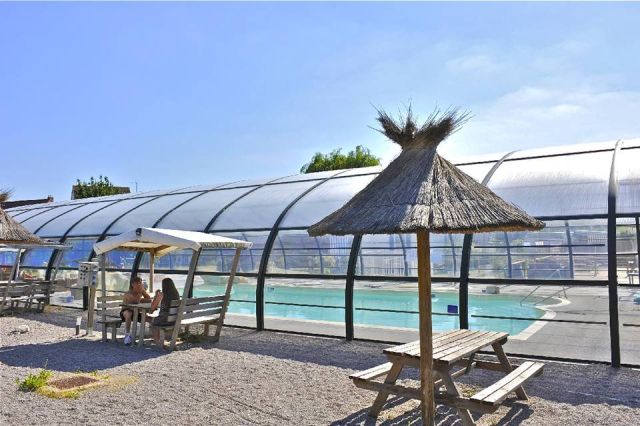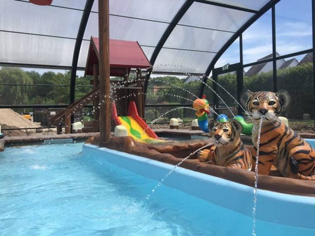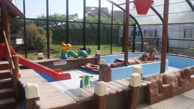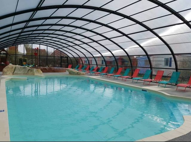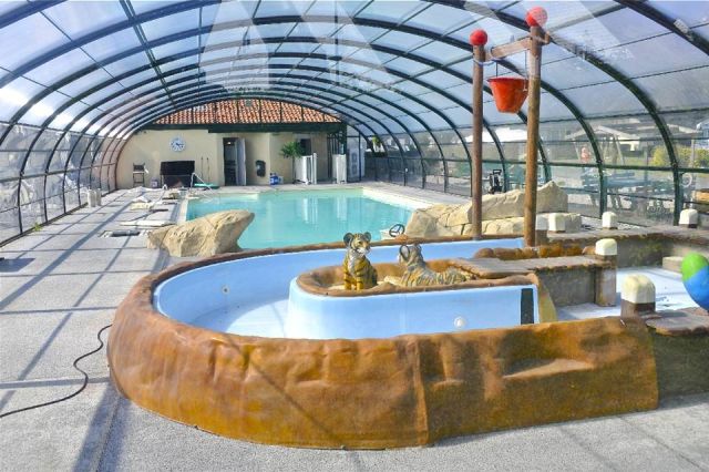 Camping avec piscine couverte et jeux aquatiques pour les enfants.